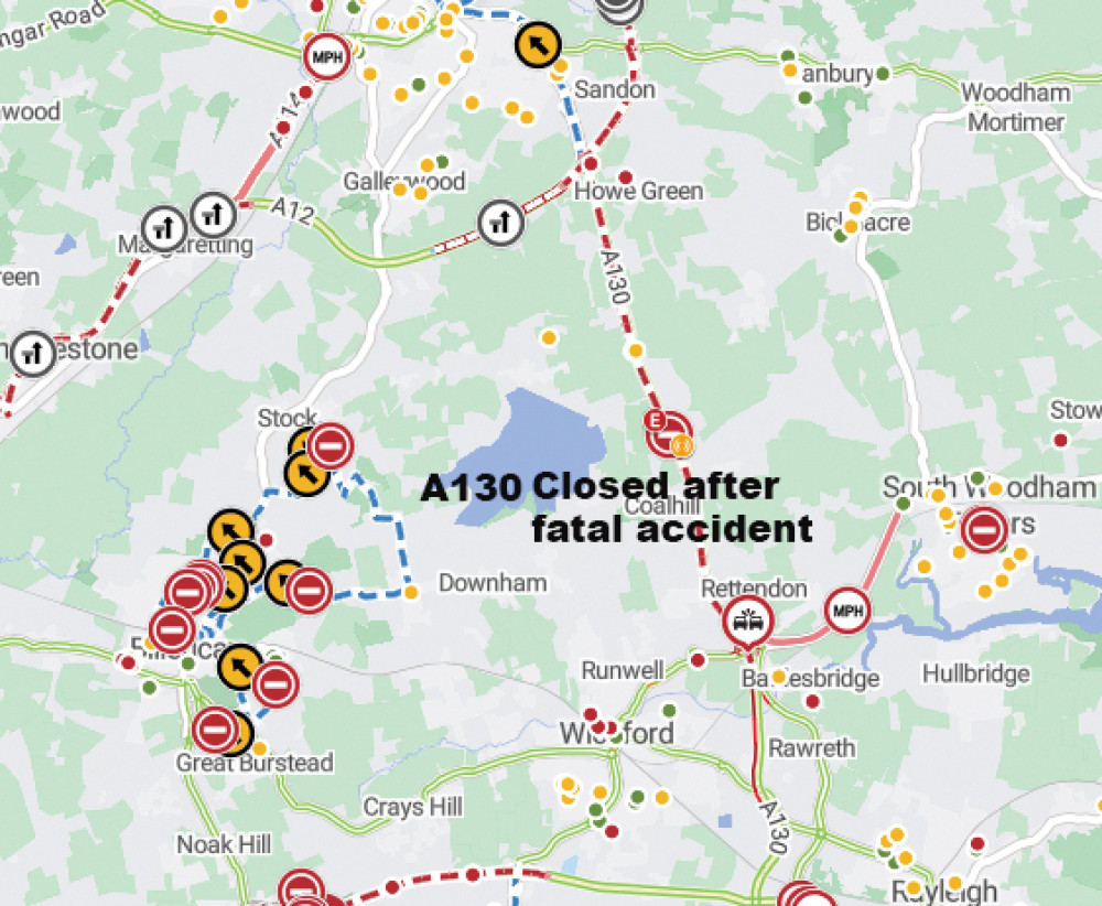 At 7am queueing traffic was reported on the A130 tailing back to a mile and a half on the A130, and two miles on Main Road up to Howe Green taking another 20 minutes.