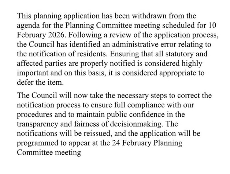 "To ensure everyone has a fair opportunity to be notified of the committee date, the application has been deferred and will now be reconsidered on Tuesday, 24 February.