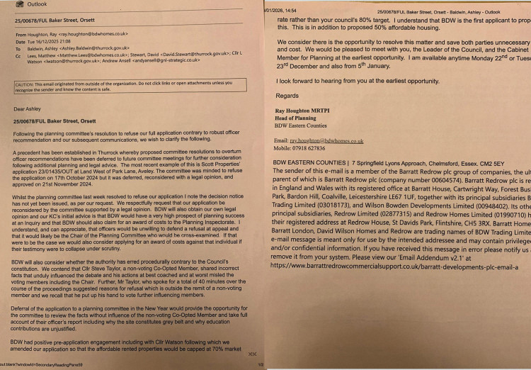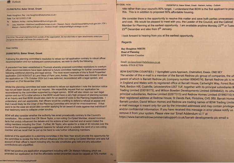After the decision to reject their scheme, Mr Houghton - who spoke on behalf of BDW at the original planning meeting - entered into correspondence with the council's planning chief, Ashley Baldwin, saying: "We respectfully request that our application be reconsidered by the planning committee, supported by a legal opinion.