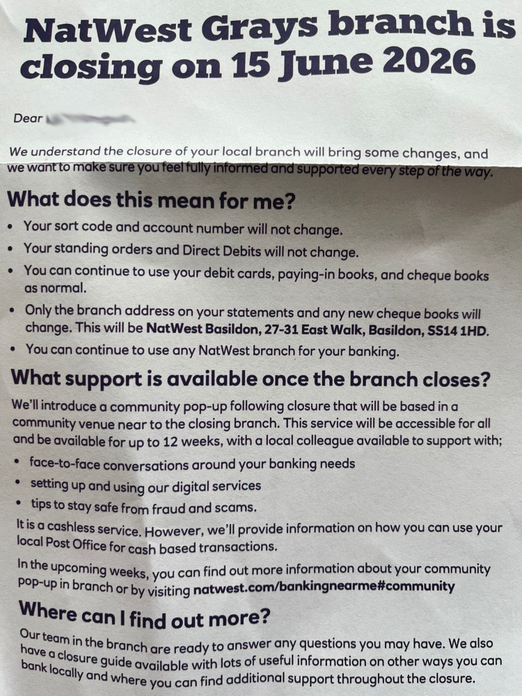 Nat West says it will be looking to set up a banking hub somewhere in the local Grays community or join an existing one. A banking hub is a shared space allowing customers from multiple banks to interact with bank staff but they are usually cashless.