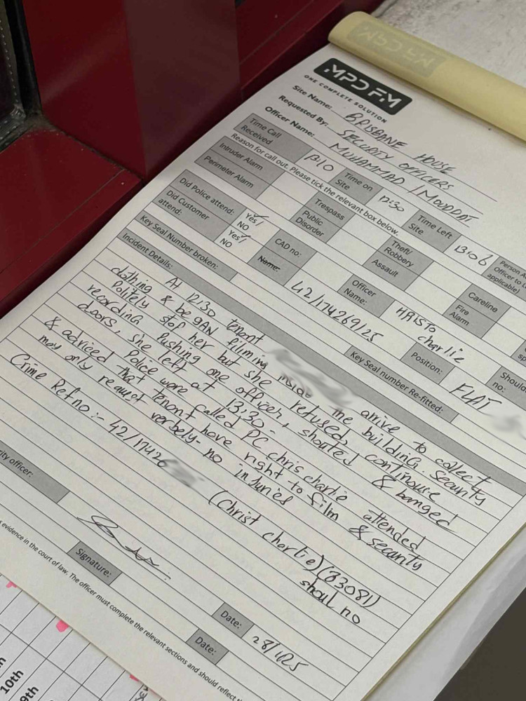 To compound the situation, the report sheet was then left in public view in the concierge area of the tower block, where it could be read by anyone passing. It was there for at least two days and photographed by other residents visiting the building.