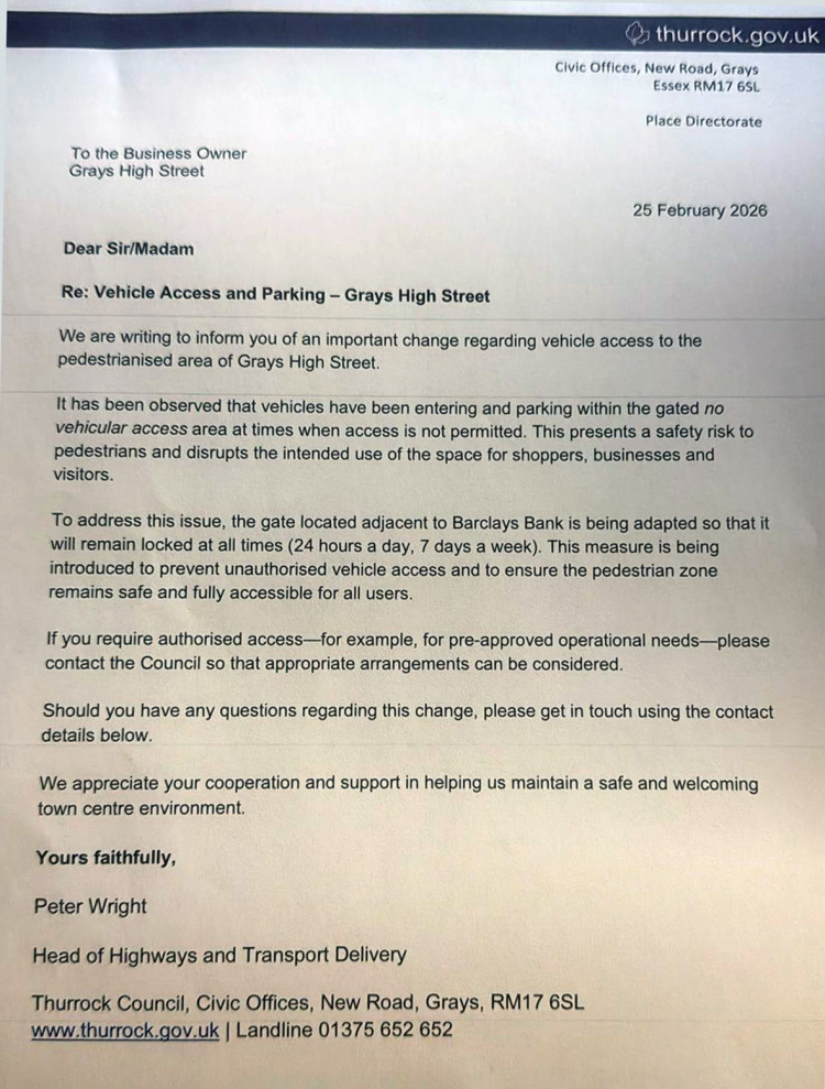 For the past couple of weeks Thurrock Nub News has reported on the volume of cars driving onto the pedestrian area of the town centre thoroughfare, with some parking recklessly and dangerously - while damage has been reported to shop frontages which have been hit by vehicles.