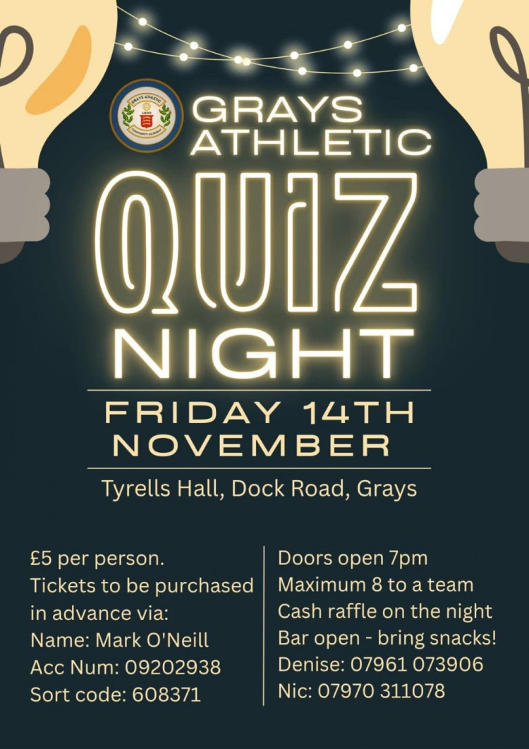 If you've got the answers, the questions are waiting at Tyrell's Hall club on Friday evening where Grays Athletic will be hosting a quiz night
