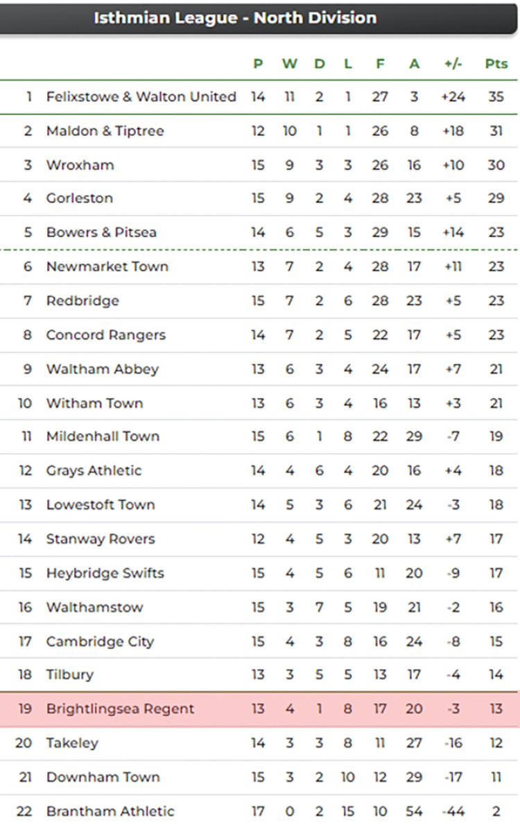 Tilbury also have an away day on Saturday (8 November) when they make the trip to another struggling side, Cambridge City, who sit a point and a place above them in 17th - though Dockers have two matches in hand.