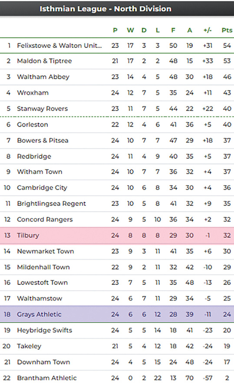 Both sides are back in action on Saturday (3 January) when Tilbury will play host to second-placed Maldon & Tiptree, while Grays go to Witham Town.