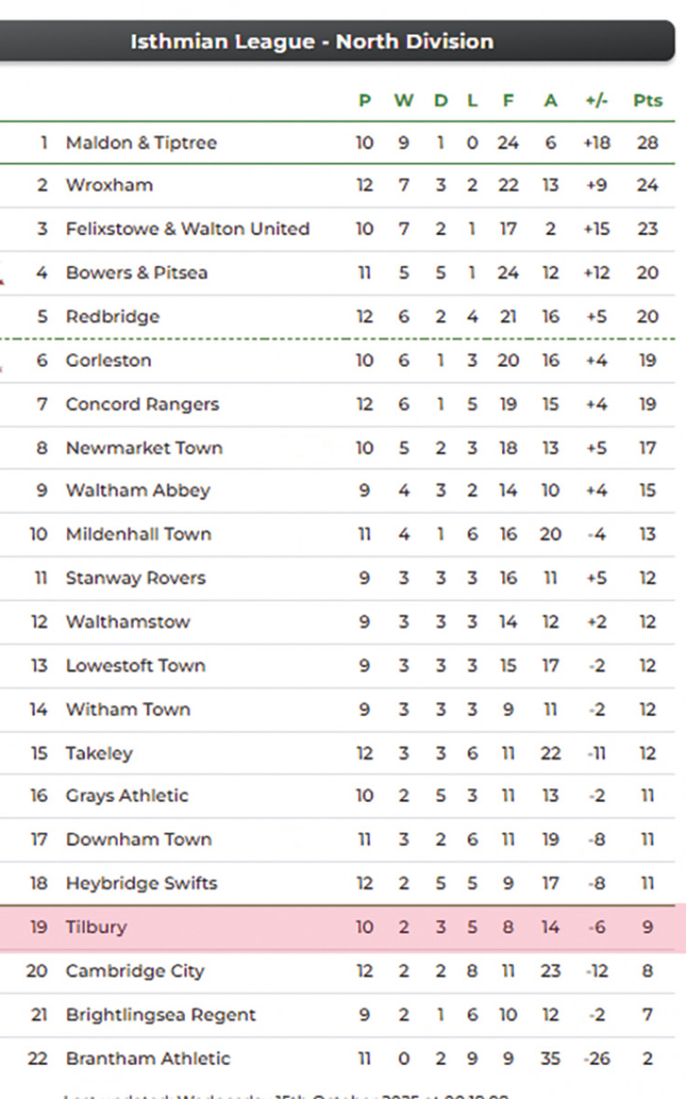 Tilbury are back in league action on Saturday (18 October) when Wroxham visit Chadfields.