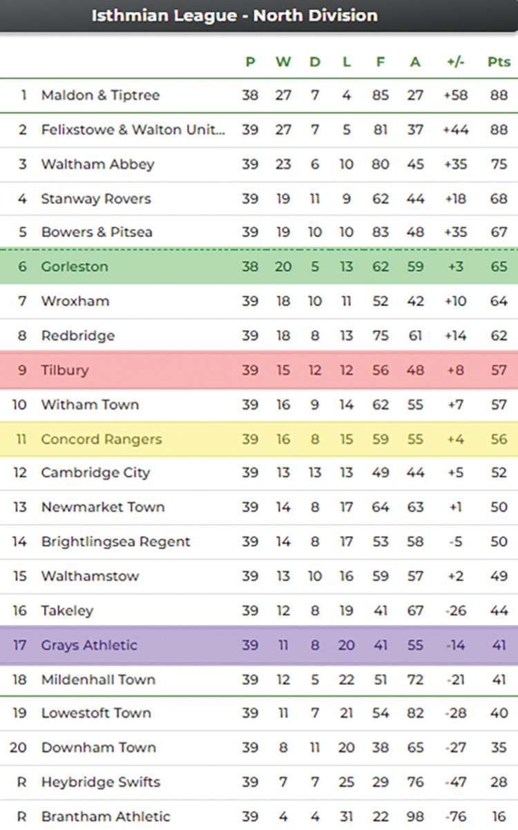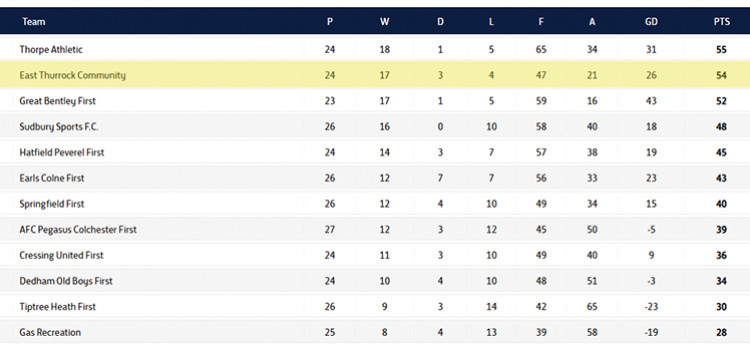In the thick of the battle at East Thurrock Community FC who sit second in the table, a point behind Thorpe Athletic and both sides have four matches left. Coming up on the pair's tails are Great Benlty who have five to play and they are three points behind Thorpe Athletic.