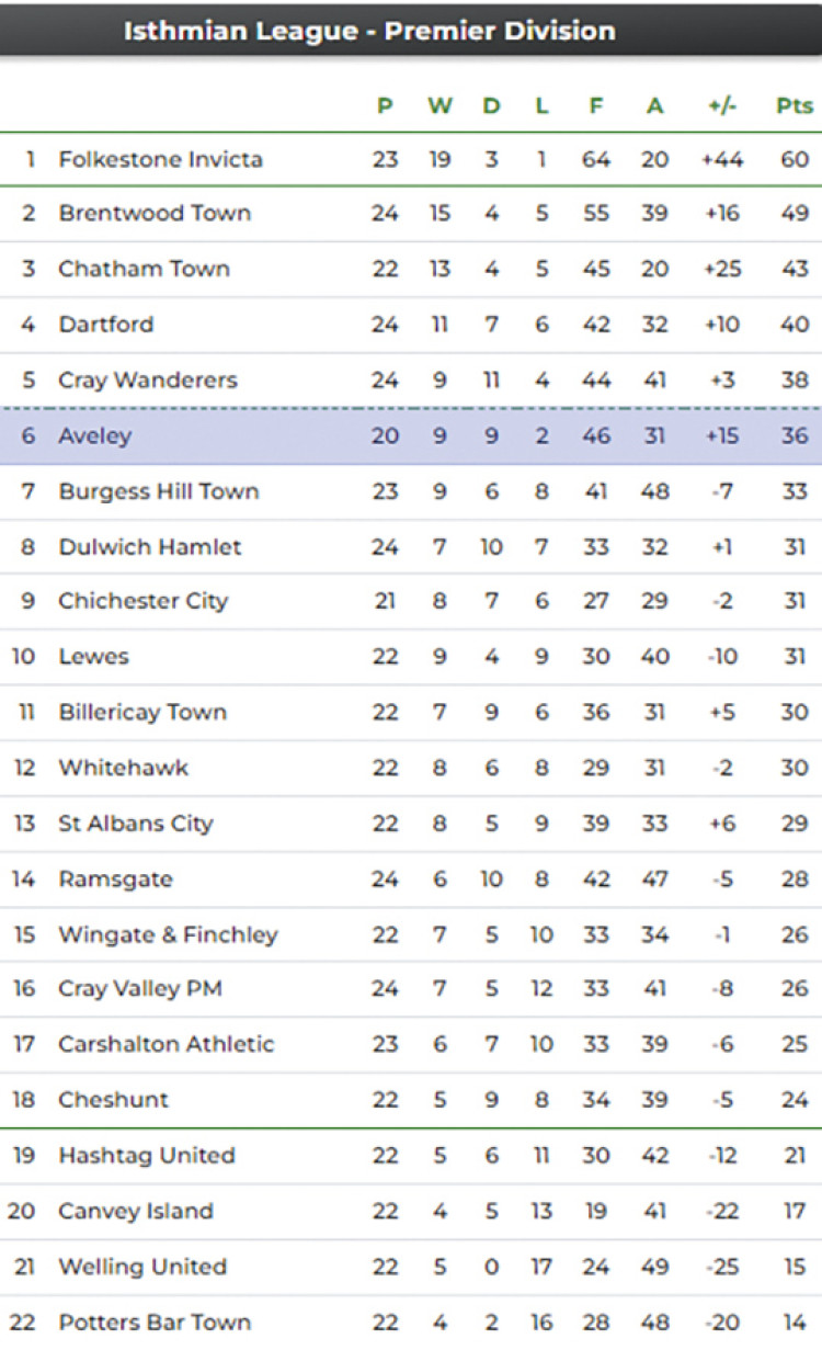 Aveley, in fifth, took a 12-match unbeaten run into clash with Hashtag United, the Tags with only one win from seven and four points from safety.