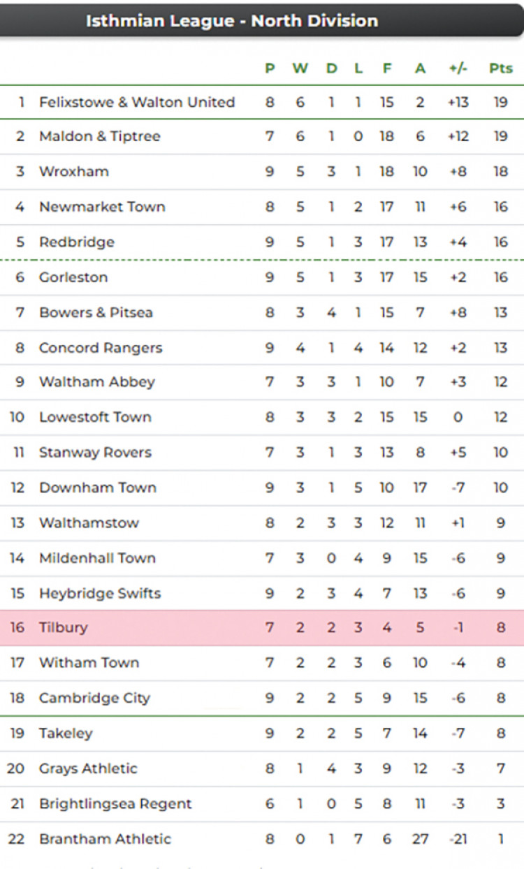 AHEAD of Saturday's FA Trophy trip to Chertsey, Tilbury gave themselves a much-need fillip with Tuesday (30 September) Isthmian North win at home to Gorleston.